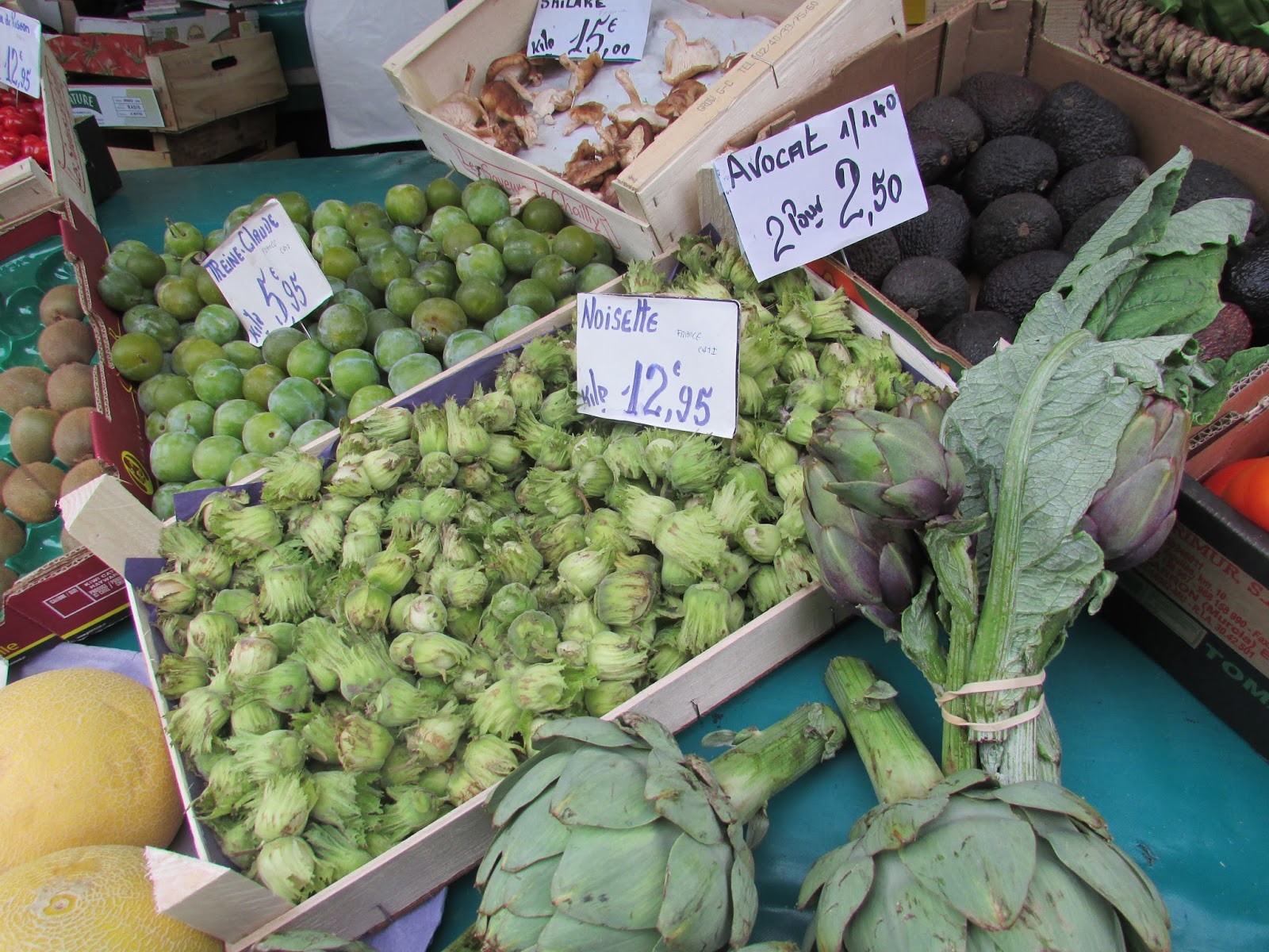 We wandered through stalls purchasing the foods we were going to prepare. Camille hadn't chosen a menu but was rather going to let the food options guide her. We bought mirabelles which are small, yellow, plum-like fruits that we decided to put in a clafoutis (a baked custard kind of thing). Then we found a squash like vegetable called a potimarron that Camille said was like a pumpkin crossed with hazelnuts. The skin can be cooked an eaten as well as the flesh. The group couldn't decide on what meat to prepare so we got a pork tenderloin (that they call filet mignon) and 2 duck magrets. I had noticed some small artichokes that I pointed out to Camille. We agreed they would be a good purchase but I didn't know what the chef had in store. After getting some fresh hazelnuts, figs, prosciutto and a cheese selection, our group walked a few blocks past Notre Dame, through Ile St. Louis, and over to the right bank for our class.